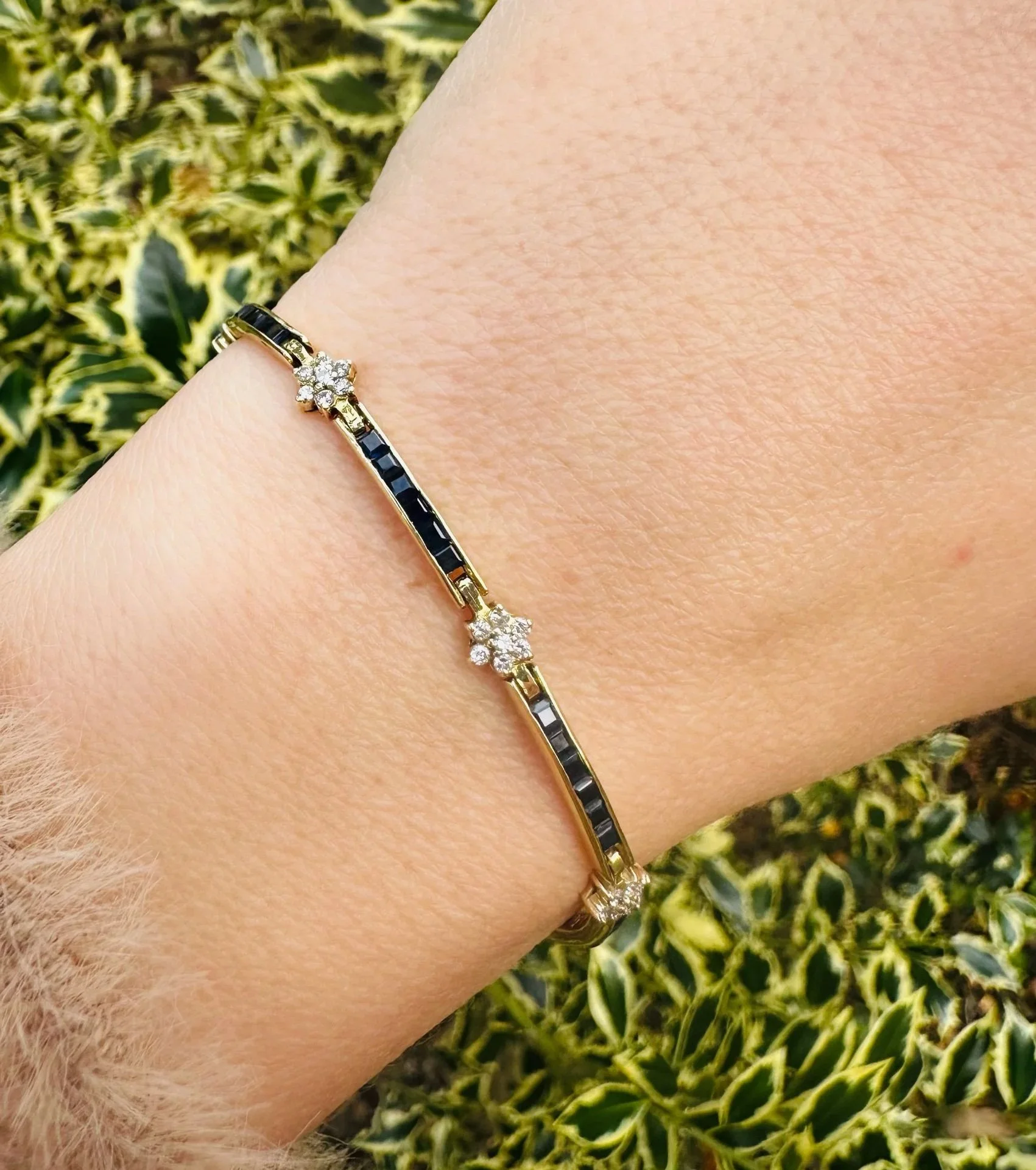 Measuring 18cm in length and a slender 5mm in width, the bracelet curves fluidly around the wrist, its articulated links giving it a subtle, graceful movement. The square-cut sapphires punctuate the piece at rhythmic intervals, a quiet echo of the lapis-and-chrome palette beloved in Parisian ateliers between the wars.